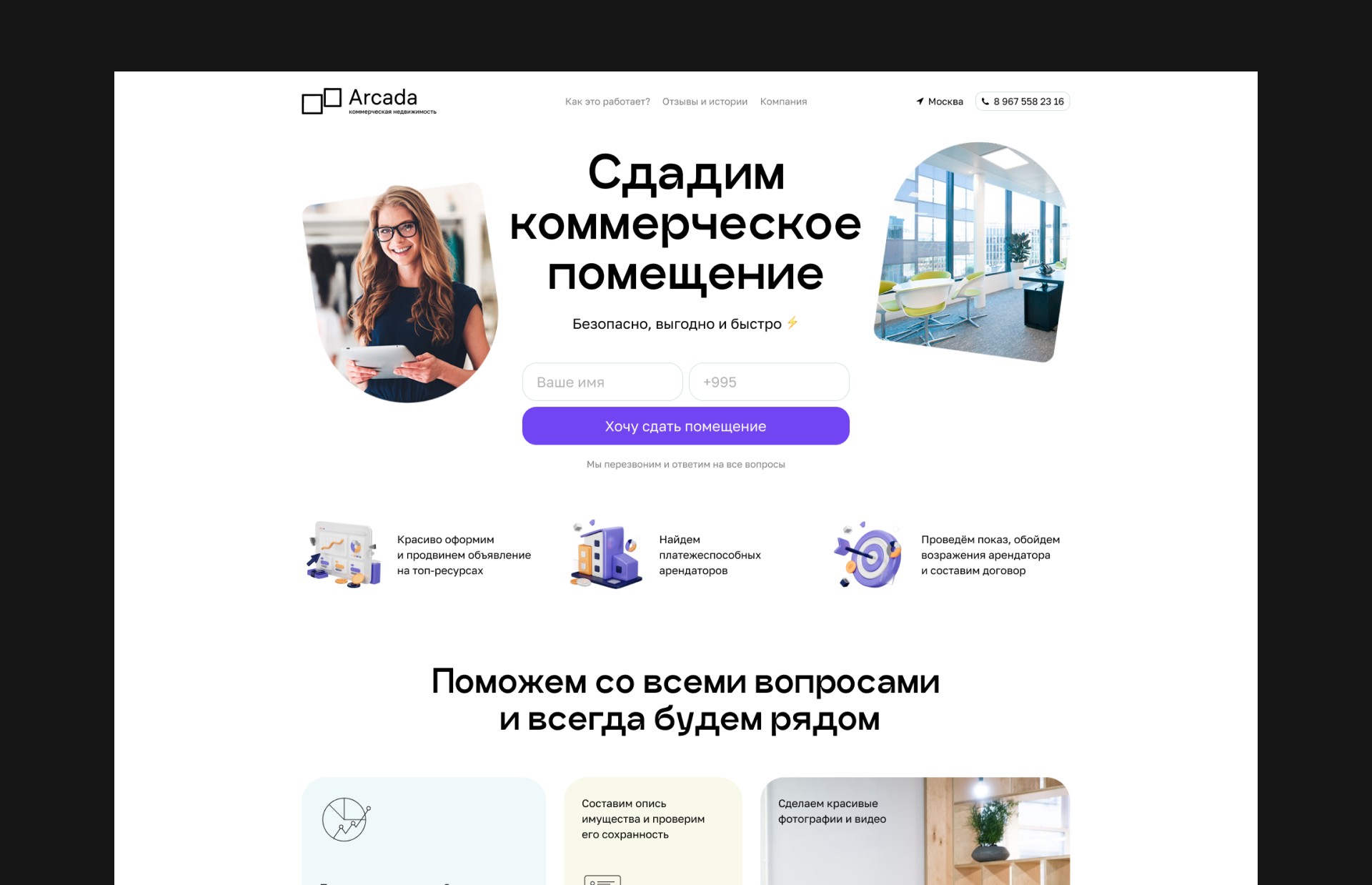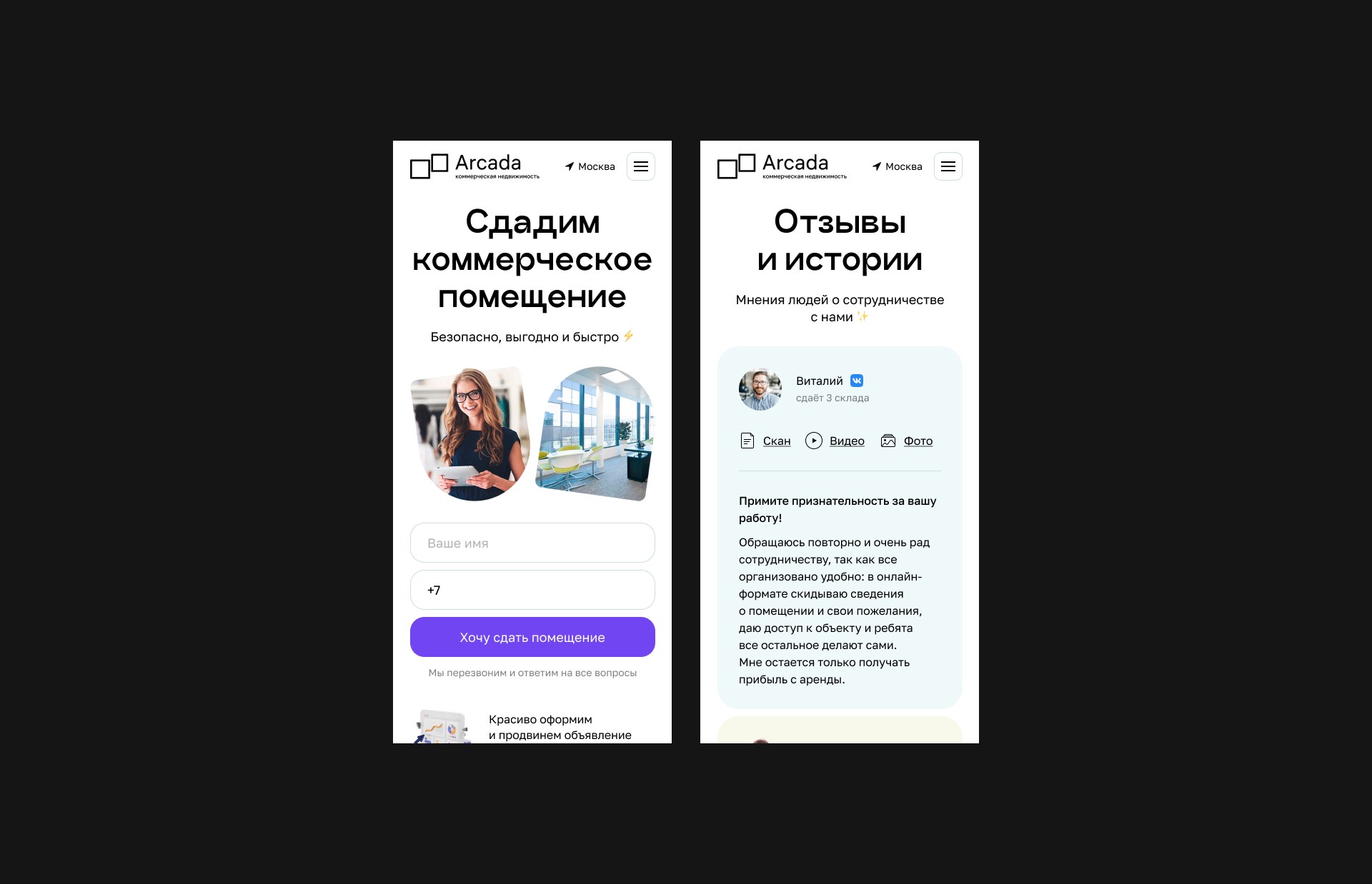 arcada estate helps property owners find tenants for commercial real estate in moscow. the website features a calm and straightforward tone of voice, speaking to the audience in simple, honest terms without complex wording — similar to a personal conversation. this approach helps build trust and a sense of connection.